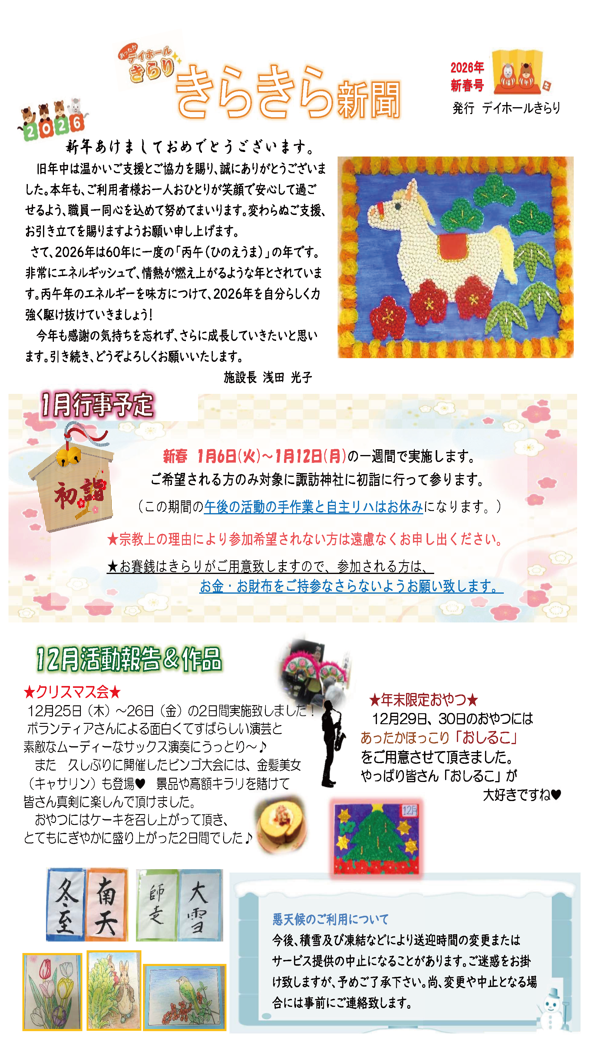 今年も 利用者の皆様と職員共同でとっても可愛い年賀状ができました。 本年も『うらら』と『きらり』 よろしくお願いいたします。